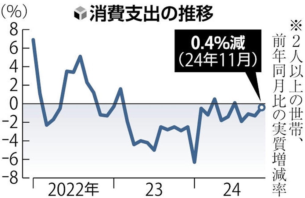 【読売新聞】 総務省が10日発表した2024年11月の家計調査によると、1世帯(2人以上)あたりの消費支出は29万5518円となり、物価変動の影響を除いた実質で前年同月比0・4%減少した。マイナスは4か月連続。例年より気温が高く、秋