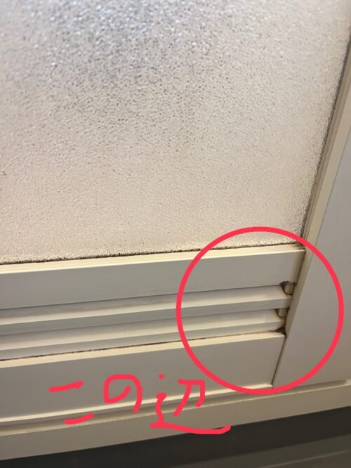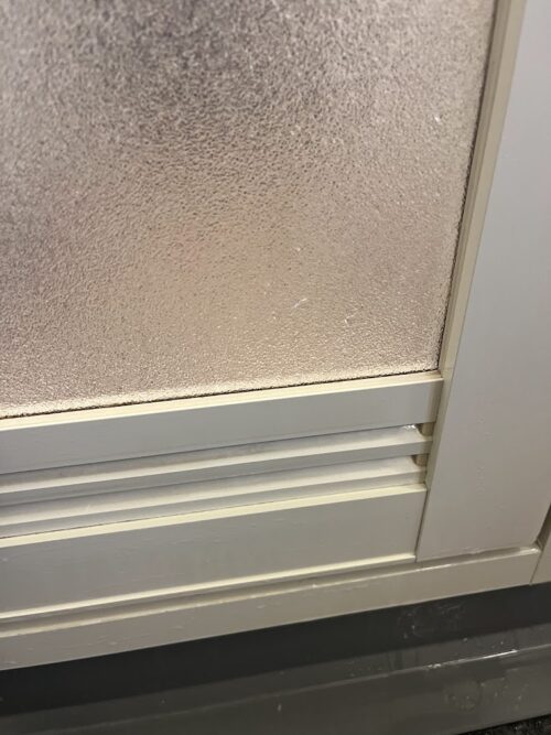 お風呂場のドアの黒く固まった汚れ。
