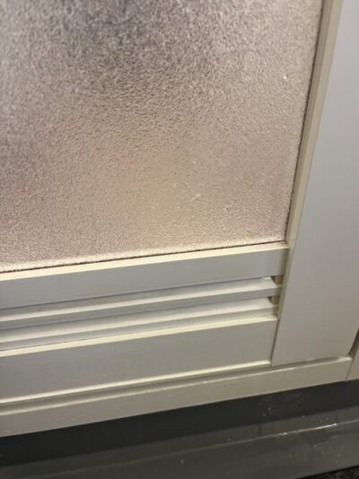 お風呂場のドアの黒く固まった汚れ。