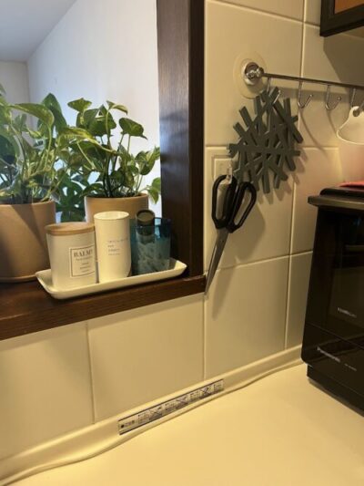 - 電子レンジの下と、壁の間のごみを取って拭く