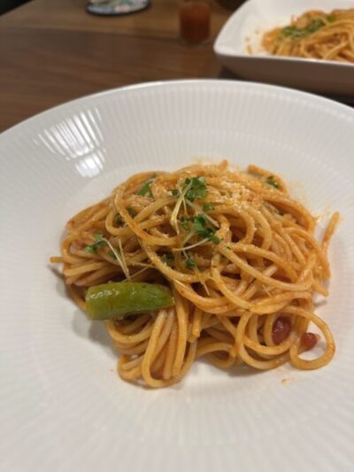 市販のパスタソースと残り野菜を使ってまたパスタ。
